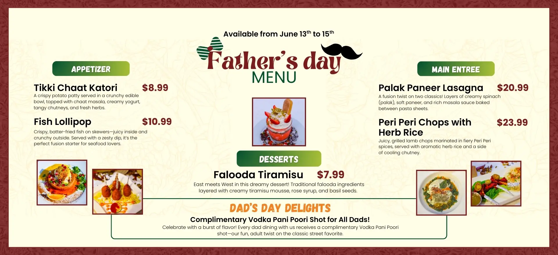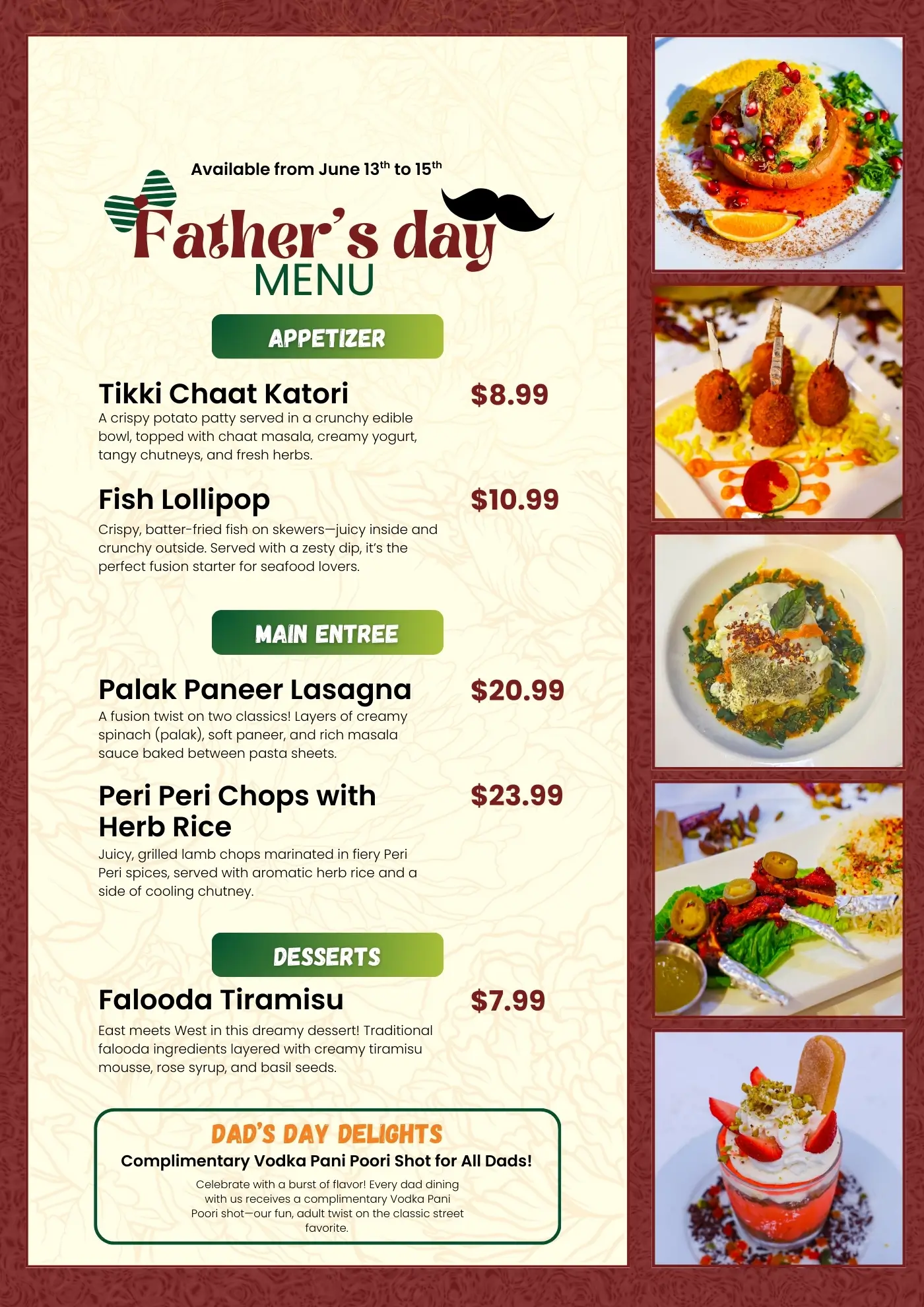 From Indian classics to Indo-Chinese and Thai delights, our menu caters to every taste, including vegetarian, vegan, and gluten-free options.