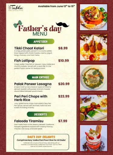 At Tabla, we recreate the rich, traditional flavors of India, making every meal a journey back to its roots.