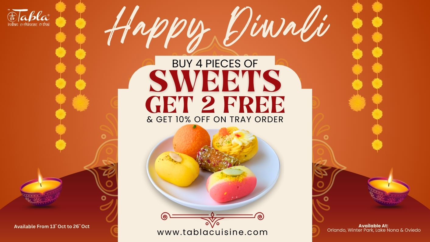 Diwali, or the Festival of Lights, is a festival of togetherness, happiness, and, of course, a time for festive sweets. Meanwhile, the team at Tabla Indian Restaurant wishes you an even sweeter festive occasion with the complimentary Diwali sweets offer running from 13th to 26th October at all outlets in Orlando, Winter Park, Lake Nona, and Oviedo.